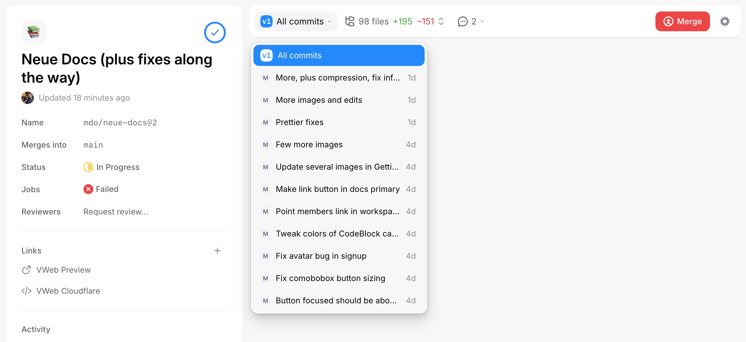 New changes are shown in the History sidebar on a branch. This sidebar shows a full history of changes to the branch with every commit. You can click on a commit to see the changes made in that commit.