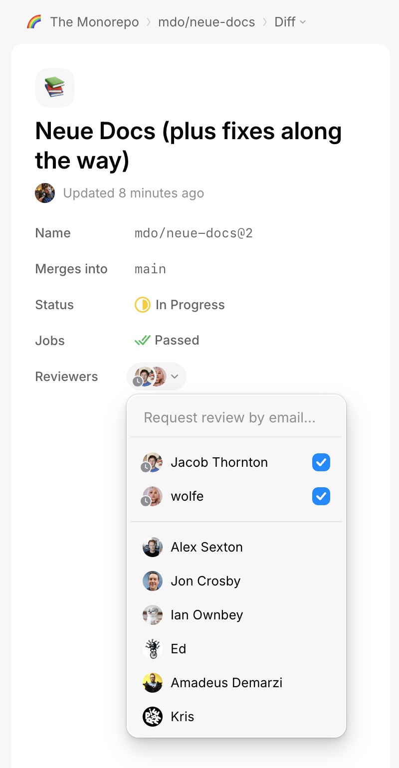 Once you’ve added reviewers, they’ll be notified in their Reviews page and workspace sidebar with a link to the branch. They can view the branch, add comments or reactions, and approve the branch.