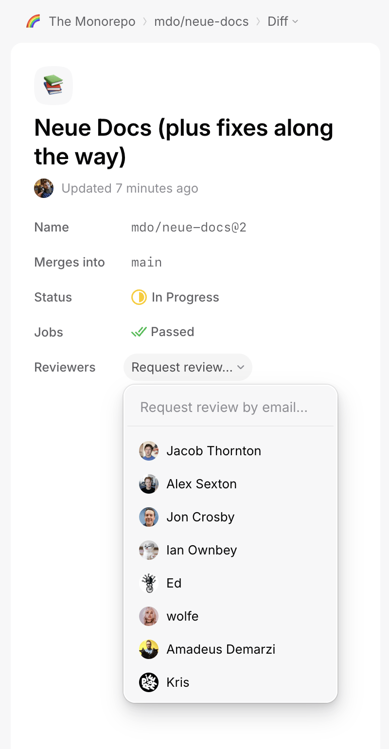 Click the Reqeust review button to open the reviewer dialog and add workspace members or others outside your workspace. Members that are authors show up as Owners. Any author can share a branch with others.