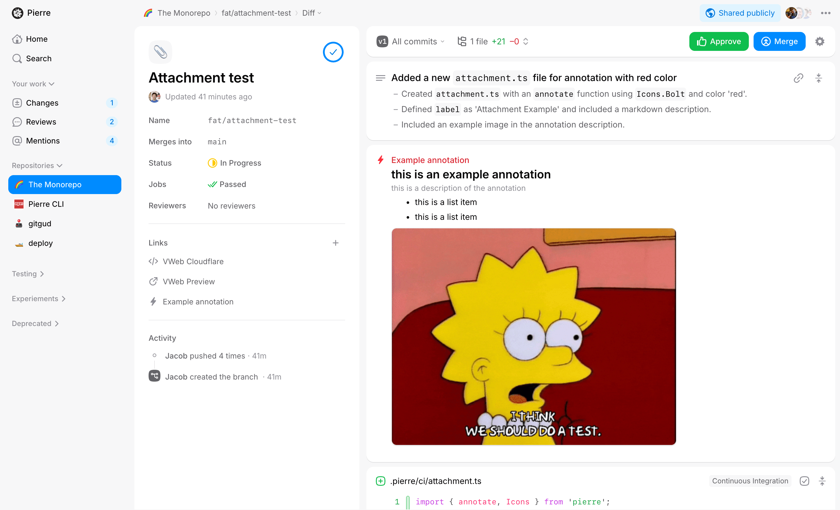 Attachments make it easy for you to anootate branches with top level messages or media. They use the same API as our Links and Code annotations, except display inline at the top of the diff.