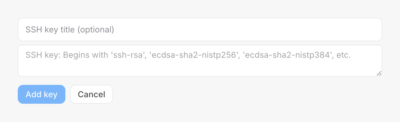 Navigate to your Pierre account settings, click the Add SSH key button, and paste the key into the new SSH key form with an optional title.