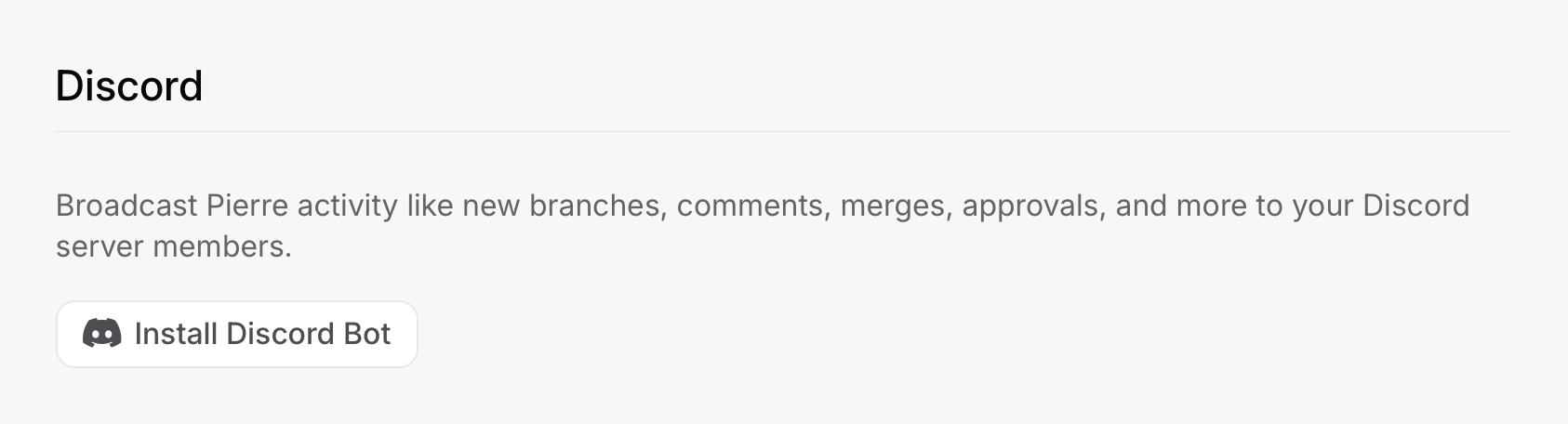 Connect Discord to your team’s Pierre to receive messages inside Discord for new activity like branching, pushing commits, commenting, merging, and more.