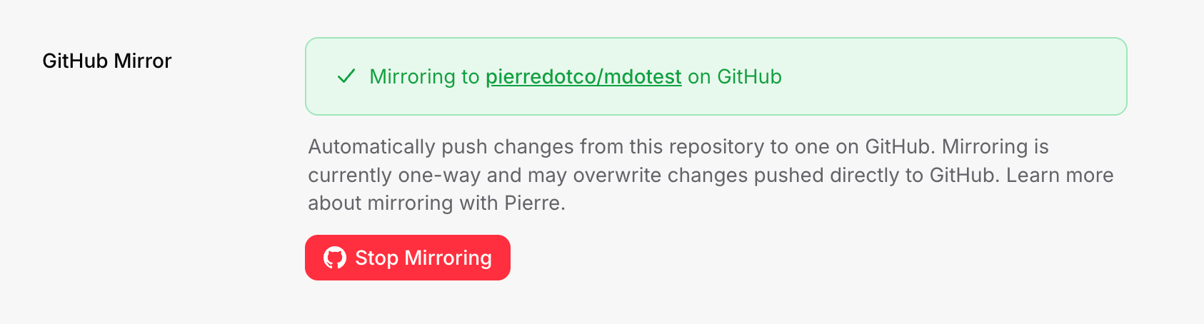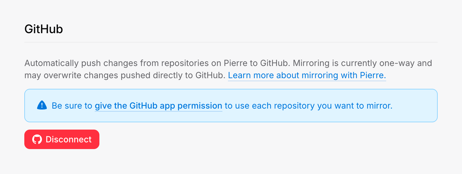Automatically push—or mirror—changes from Pierre to a repository on GitHub. Mirroring is currently one-way and may overwrite changes pushed directly to GitHub.