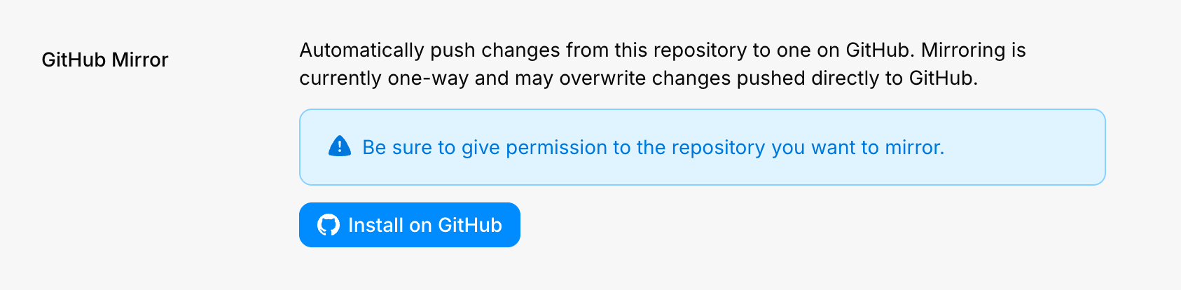 Once you’ve installed the Pierre app in your GitHub organization, you can head to the settings page for any repository on Pierre that you’d like to mirror from. You can reach this page by clicking the ellipsis button next to the repository’s name in the sidebar. Find the section labeled GitHub Mirror.