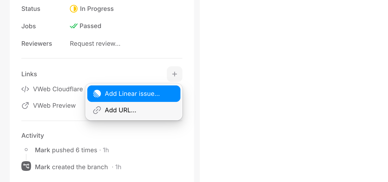 Attach the issue using the "Add Linear issue…" button in the change sidebar.