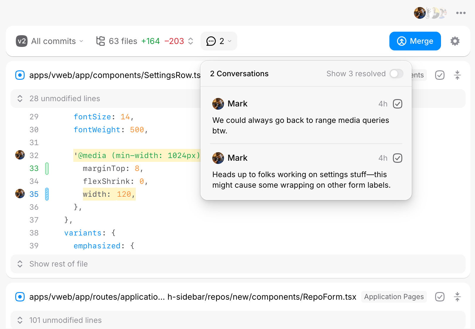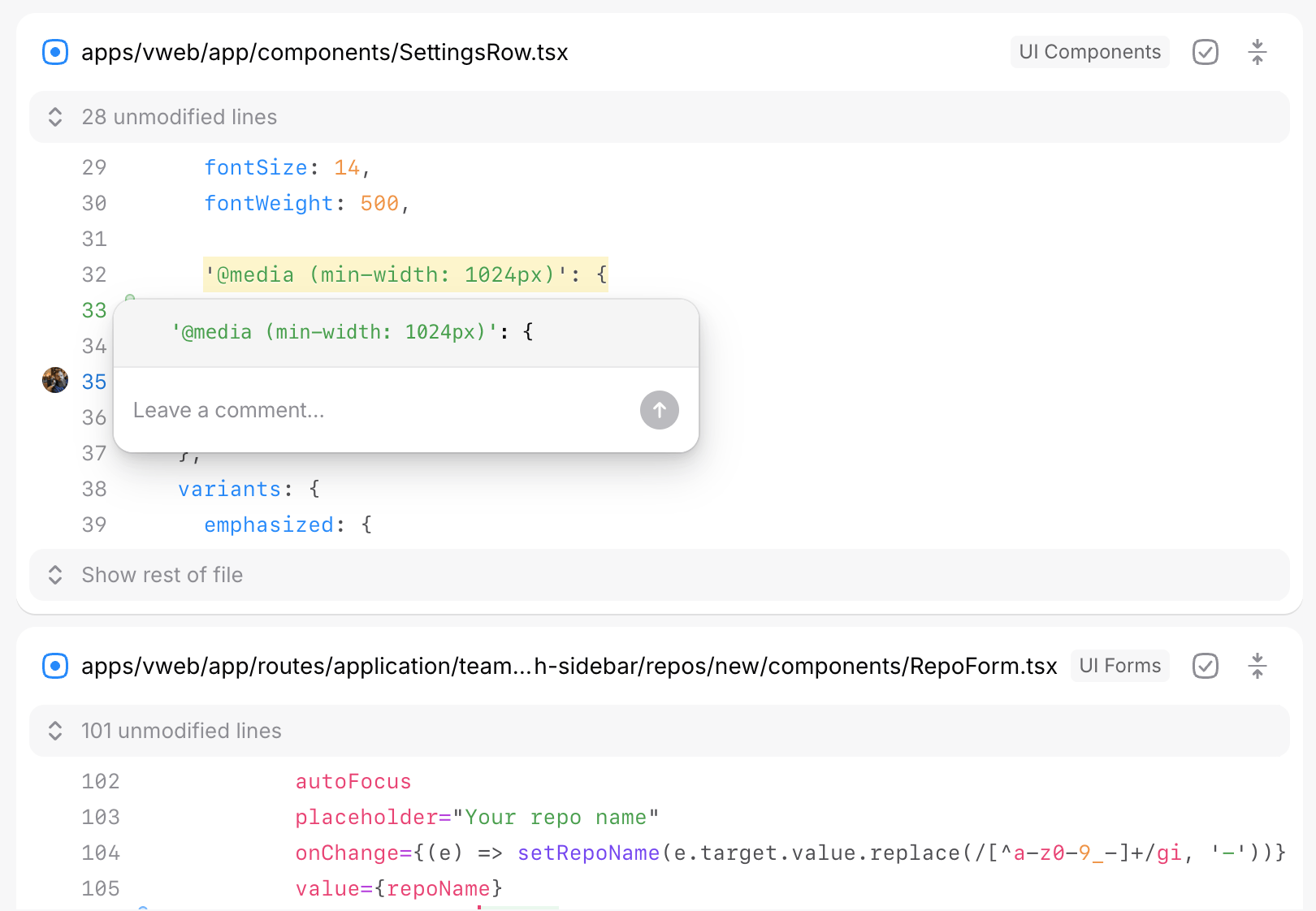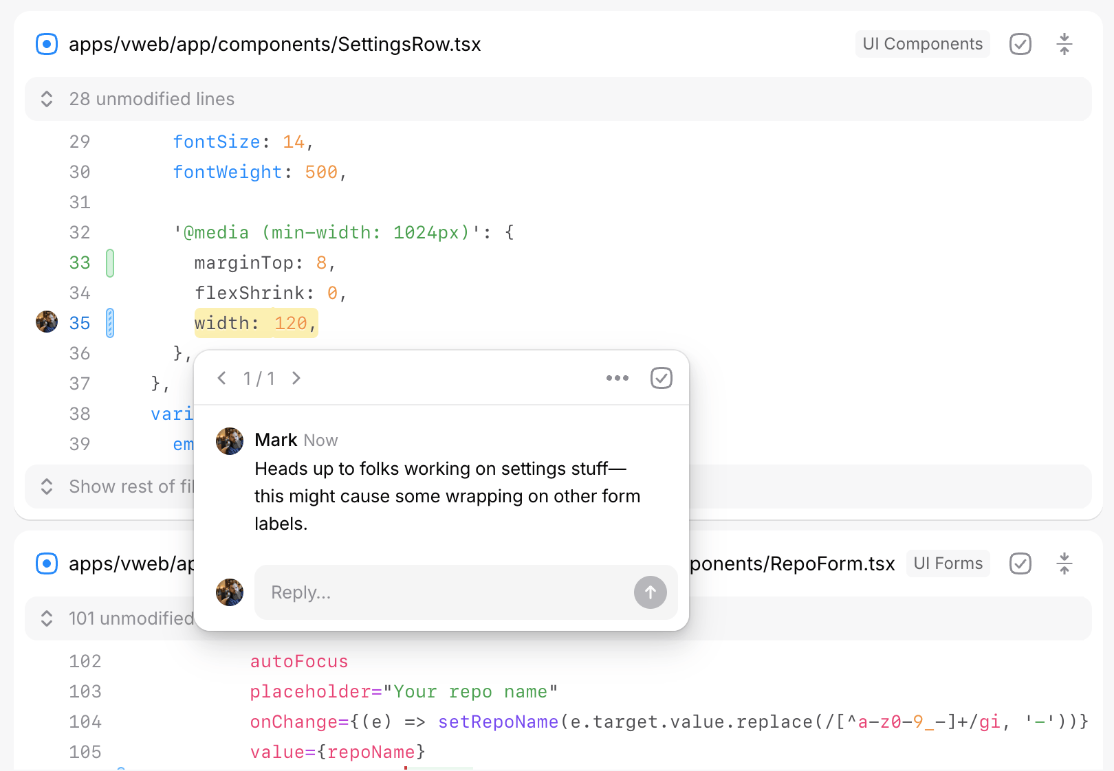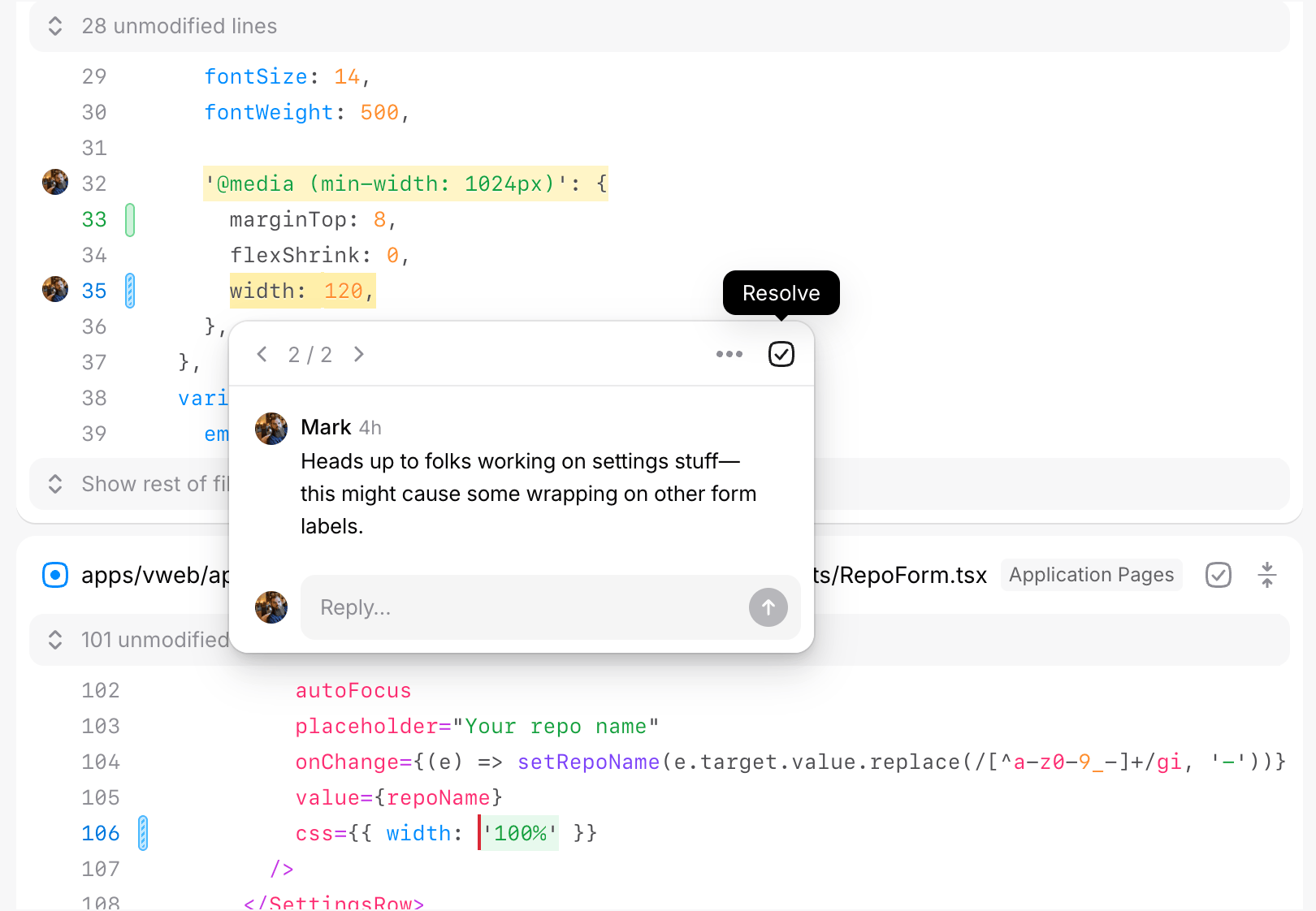 Once posted, a comment highlight will be added over the code or content you commented on. Down the left rail of the diff, you’ll also see an avatar of whoever commented. This makes it easy to scan down the page for things to pay attention to in your diff.