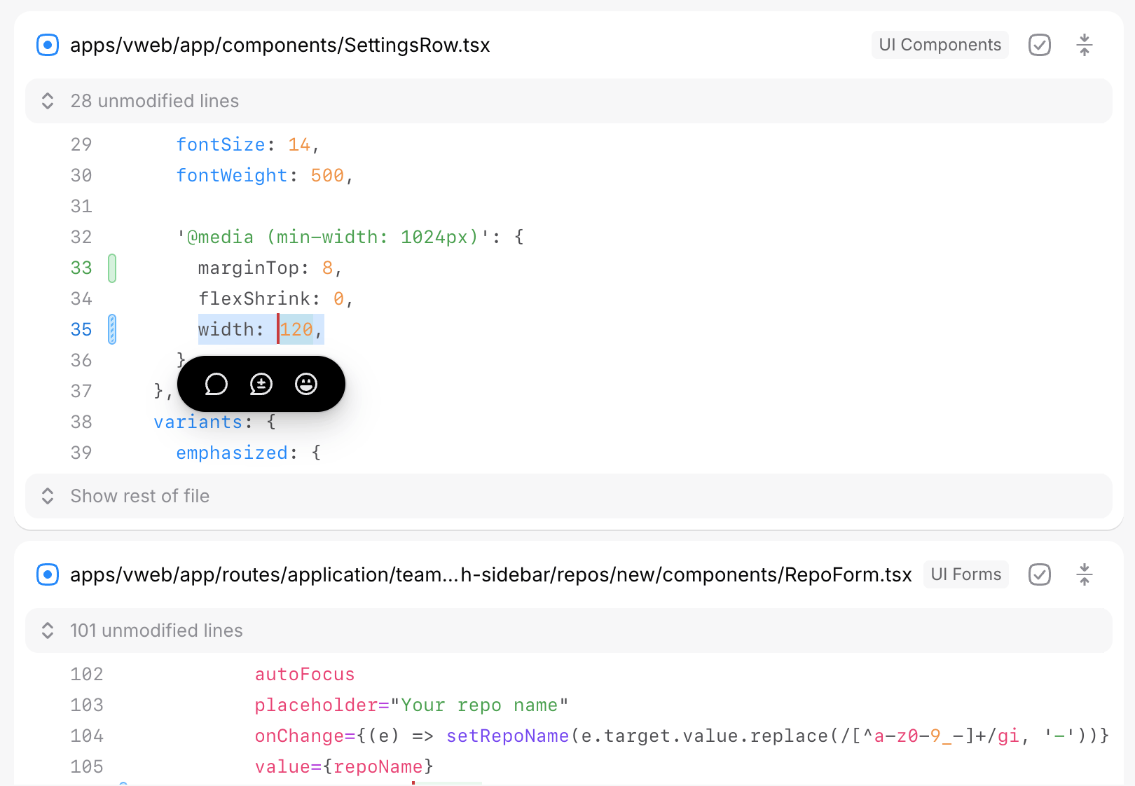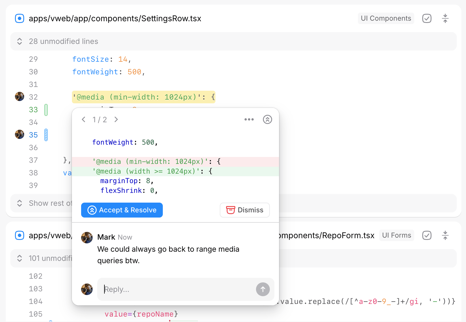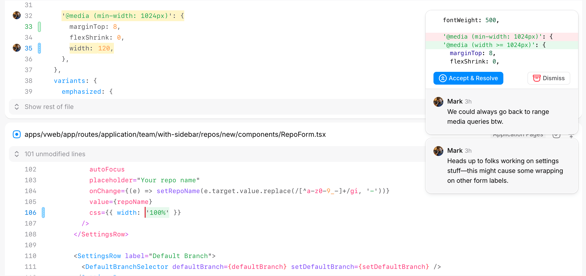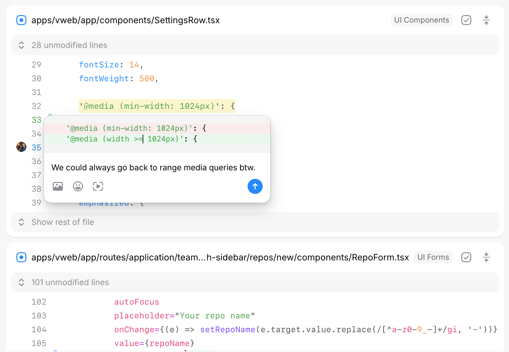 Suggestions are a great way to provide feedback on a branch. They’re exactly like comments, except they come with a small diff that can be applied to the branch if the author chooses to accept your edit.