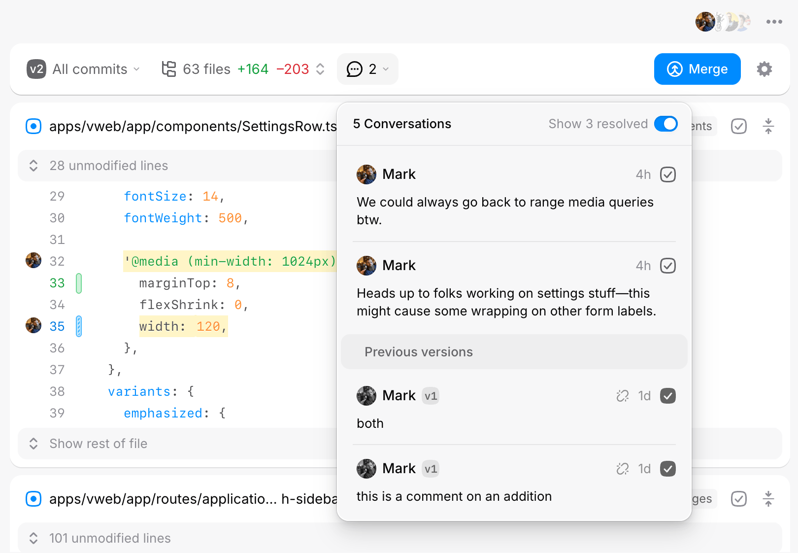 Changes have a toolbar at the top of the page that allows you to navigate commits, files, comments, and more. For comments, we provide a single inbox of all comments across all files, including across versions. From here, you can navigate to any comment or resolve them right from the toolbar.
