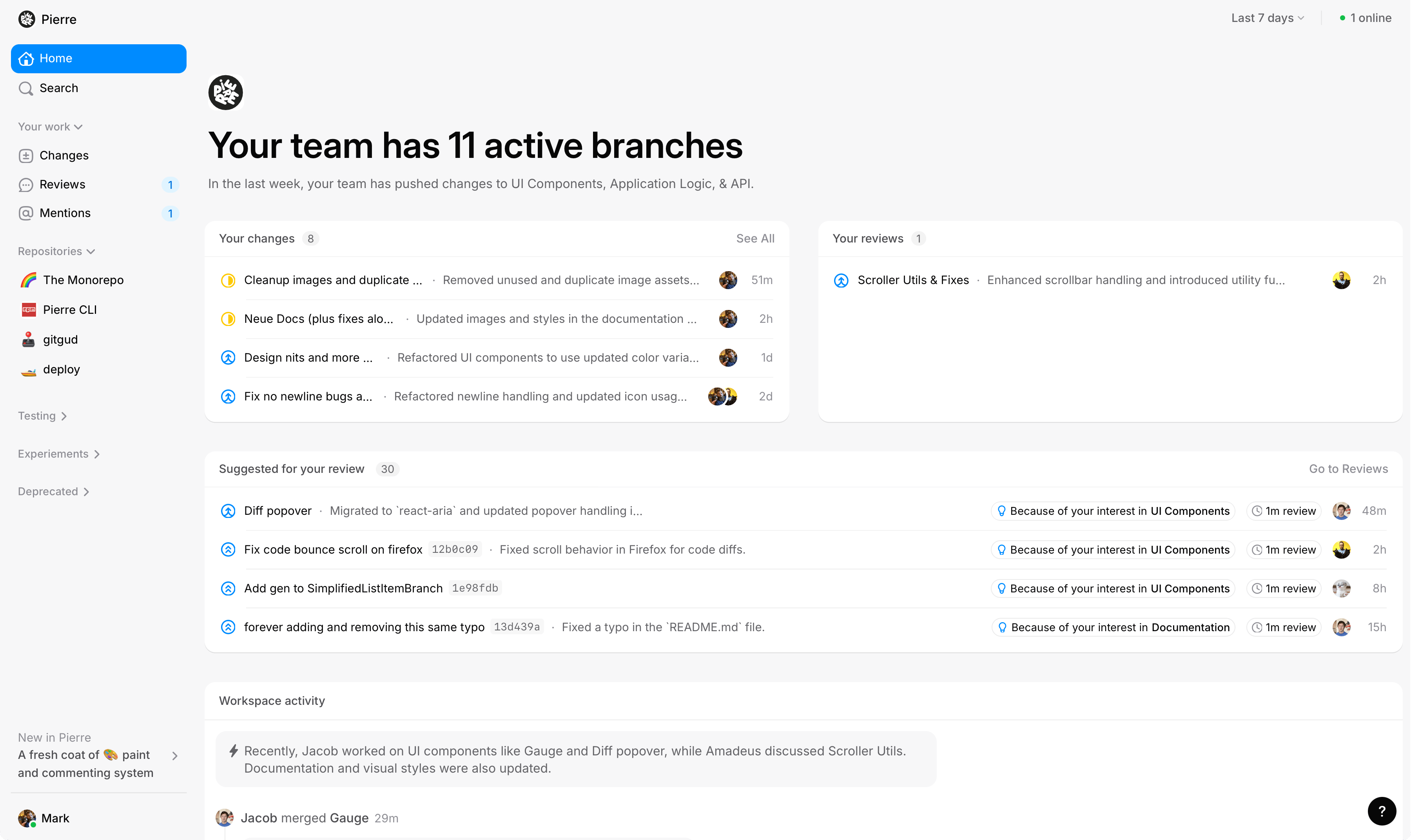 Pierre wants you to enjoy code review with your team. So, we built a ~NEW~*~ Git platform to do just that.