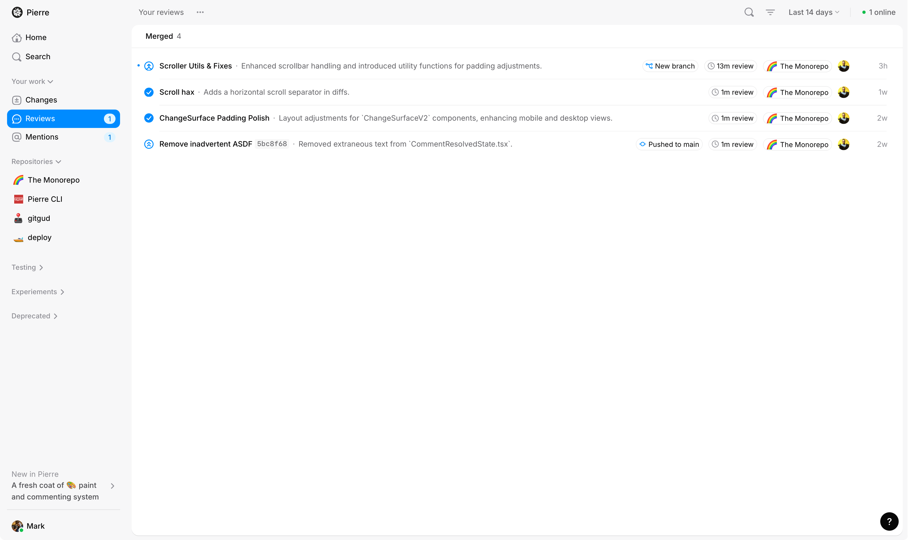 The next page you’ll see is Your Work > Changes, which shows all the changes you’ve contributed to that are open or merged. By default, Pierre will show you the last 7 days of activity, adjustable via the time picker on the top right of your window.