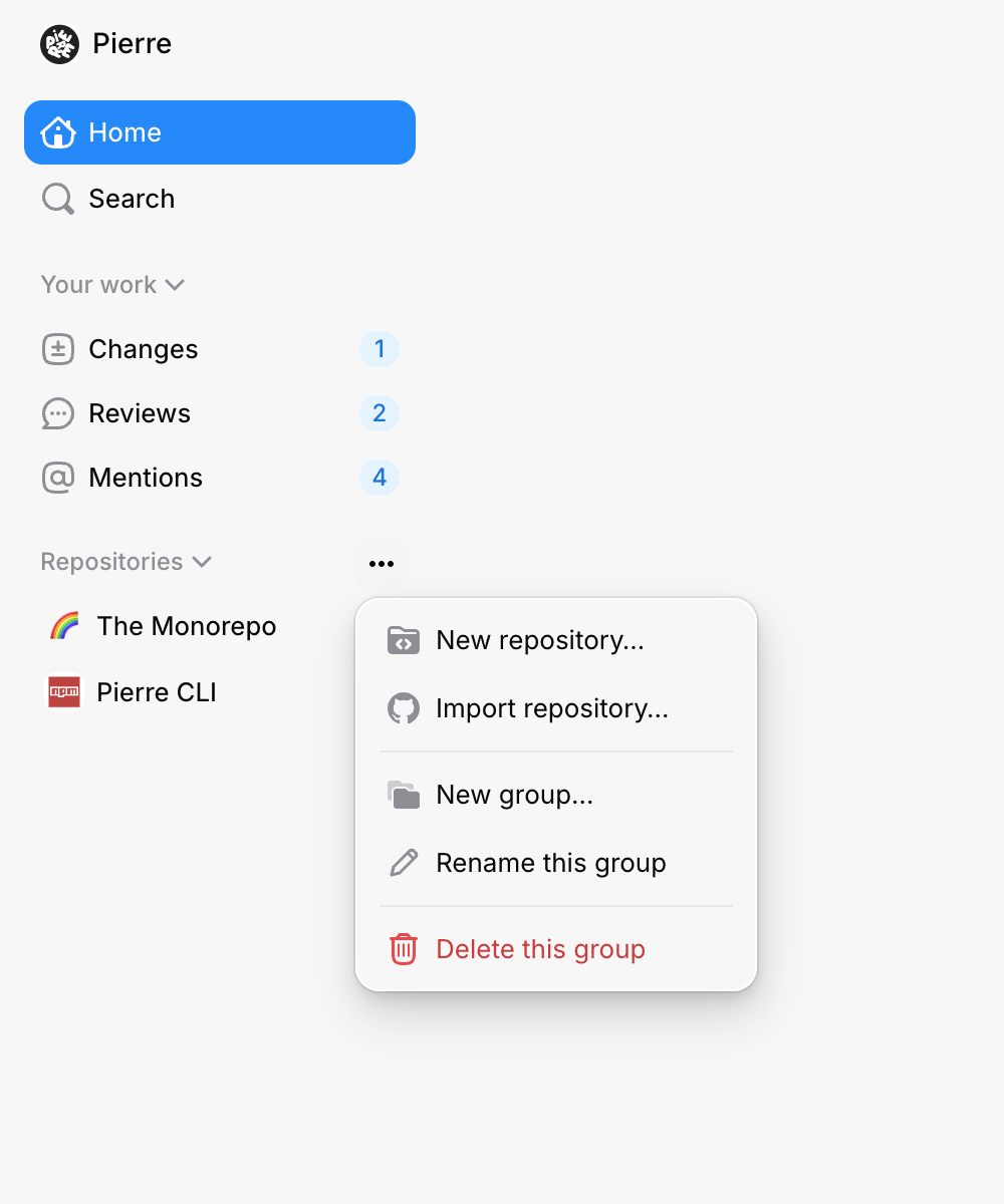 Each group's context menu (accessed via the button on hover) lets you manage groups and create new repositories."