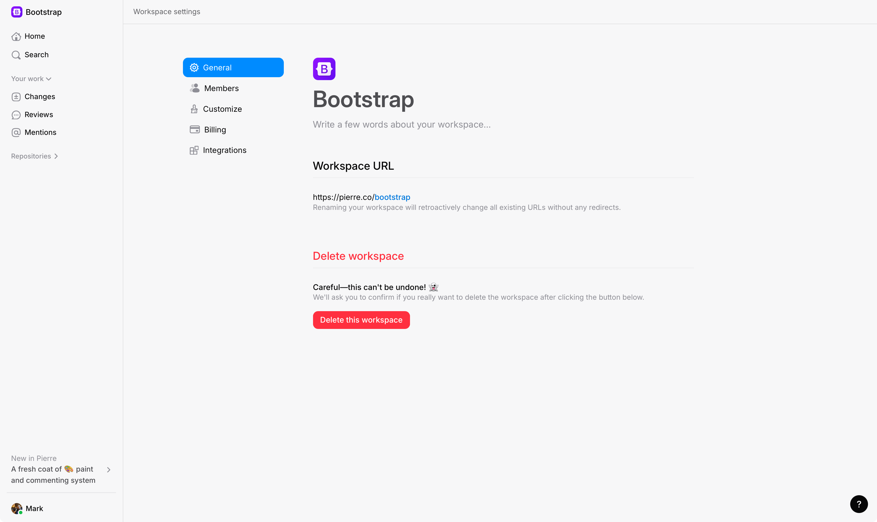 Manage your workspace settings, including name, description, URL, and integrations.